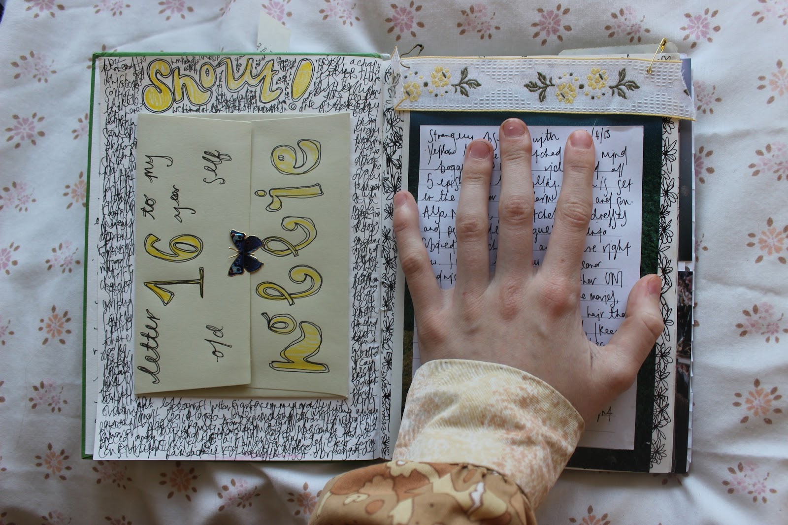 My Journal (that Ibe gave me) where I tried to copy the type font of a disney vinyl, a vintage postcard and a picture of me last summer.